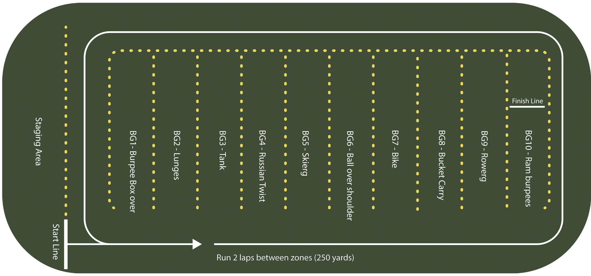 The race combines 10 physical fitness battlegrounds with (10) 250 yard runs. The race starts with a 250 yard run, followed by the first fitness battleground, followed by a run, then the second fitness battleground and so on until all 10 runs and all 10 battlegrounds are complete. Battlegrounds and runs must be completed in order.
